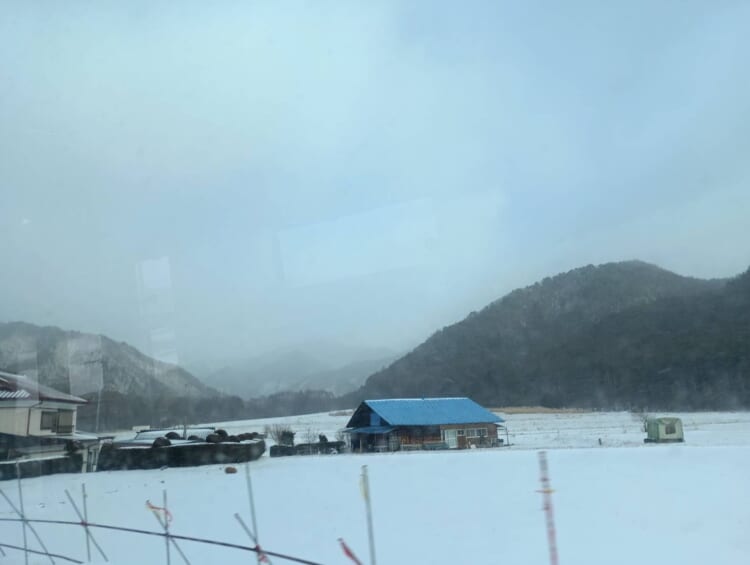 新地蔵トンネルをこえると 雪が舞っていて遠くの山々が霞んで見えました