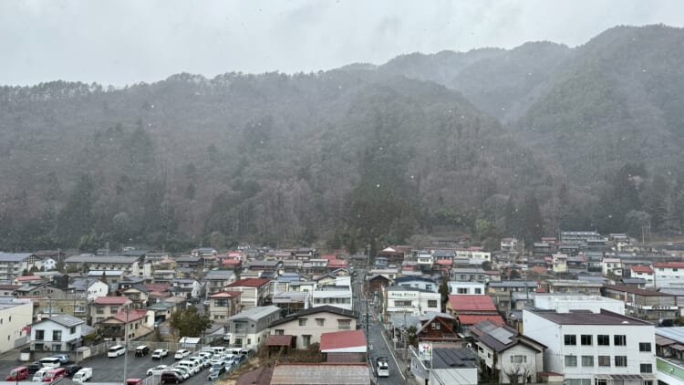 JR木曽福島駅周辺も、時々強くふぶきます。