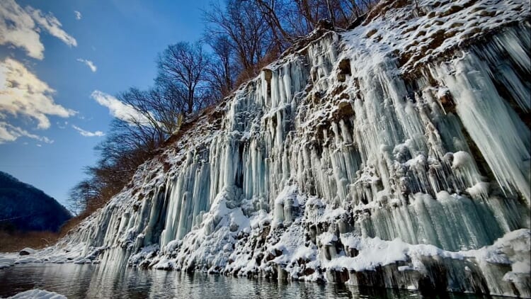 冬の冷え込みによって西野川沿いの岸壁に現れる、木曽を代表する冬の絶景スポットです。