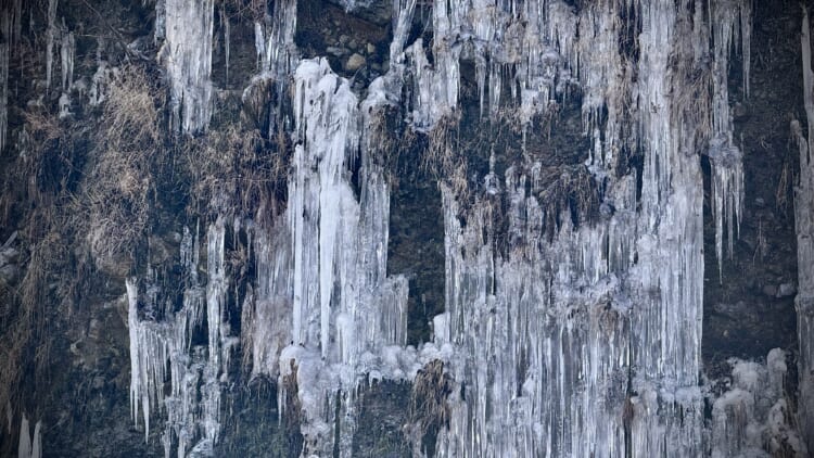岩肌から滴る湧水が凍りつき何本もの氷柱となって連なる光景は、厳しい寒さの中だからこそ出会える自然の造形美。