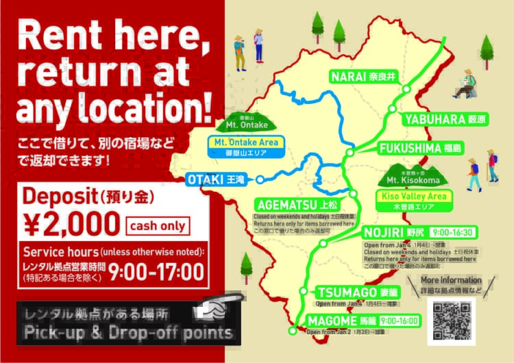 木曽各地のレンタル拠点で借りて、別の場所で返却することも可能。