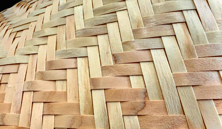 蘭桧笠は、木曽が誇る木曽ヒノキを薄く薄く剥き、一つひとつ職人の手で編み上げてつくられる笠です。