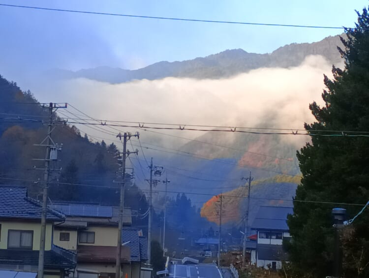 早朝の福島・伊谷地区から城山を望むと、山裾にかかる雲がまるで雲海のように広がっていました。